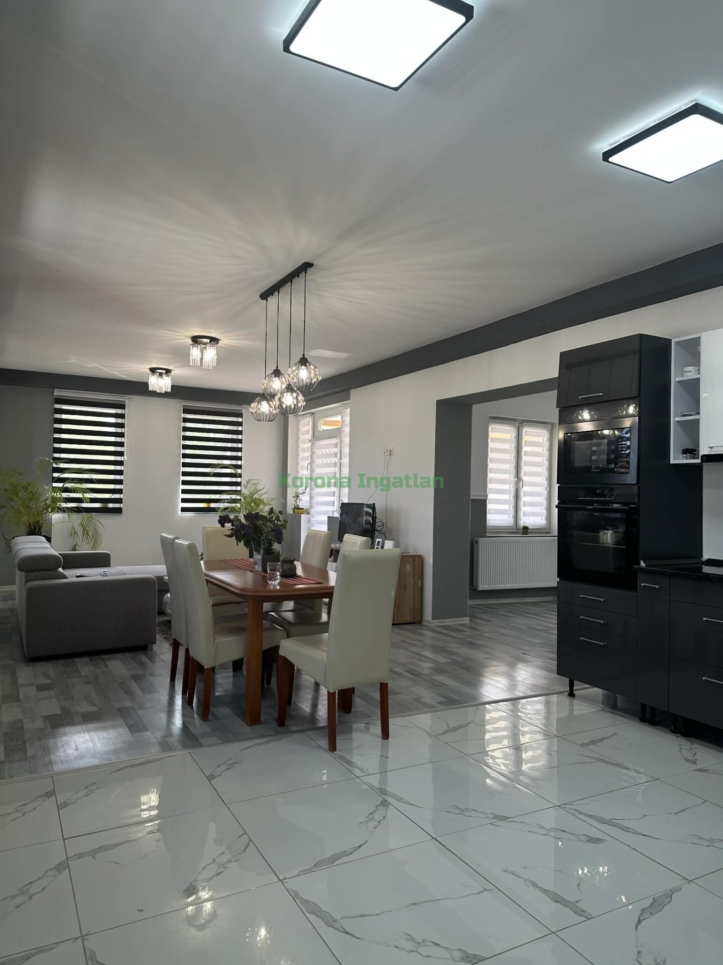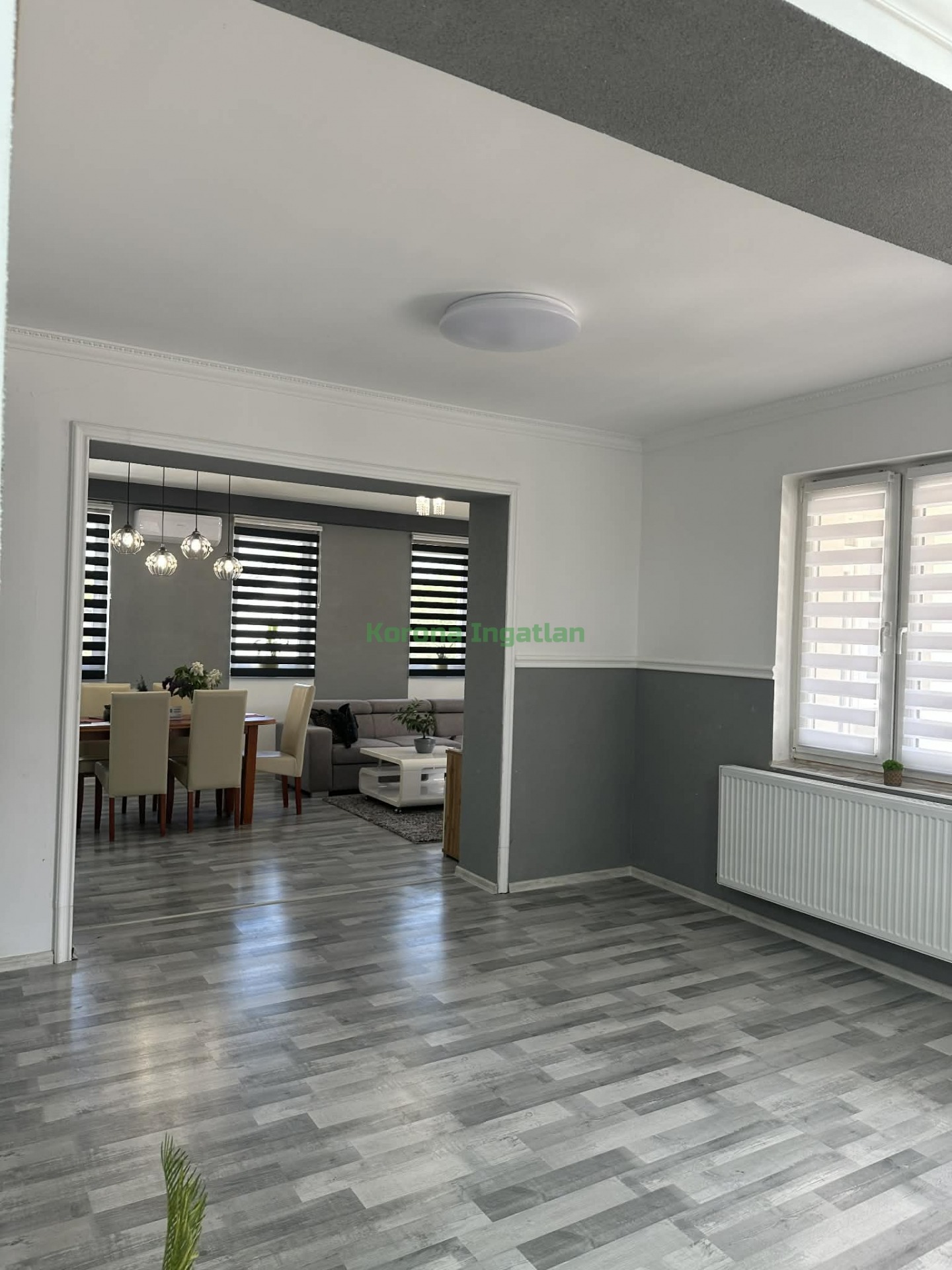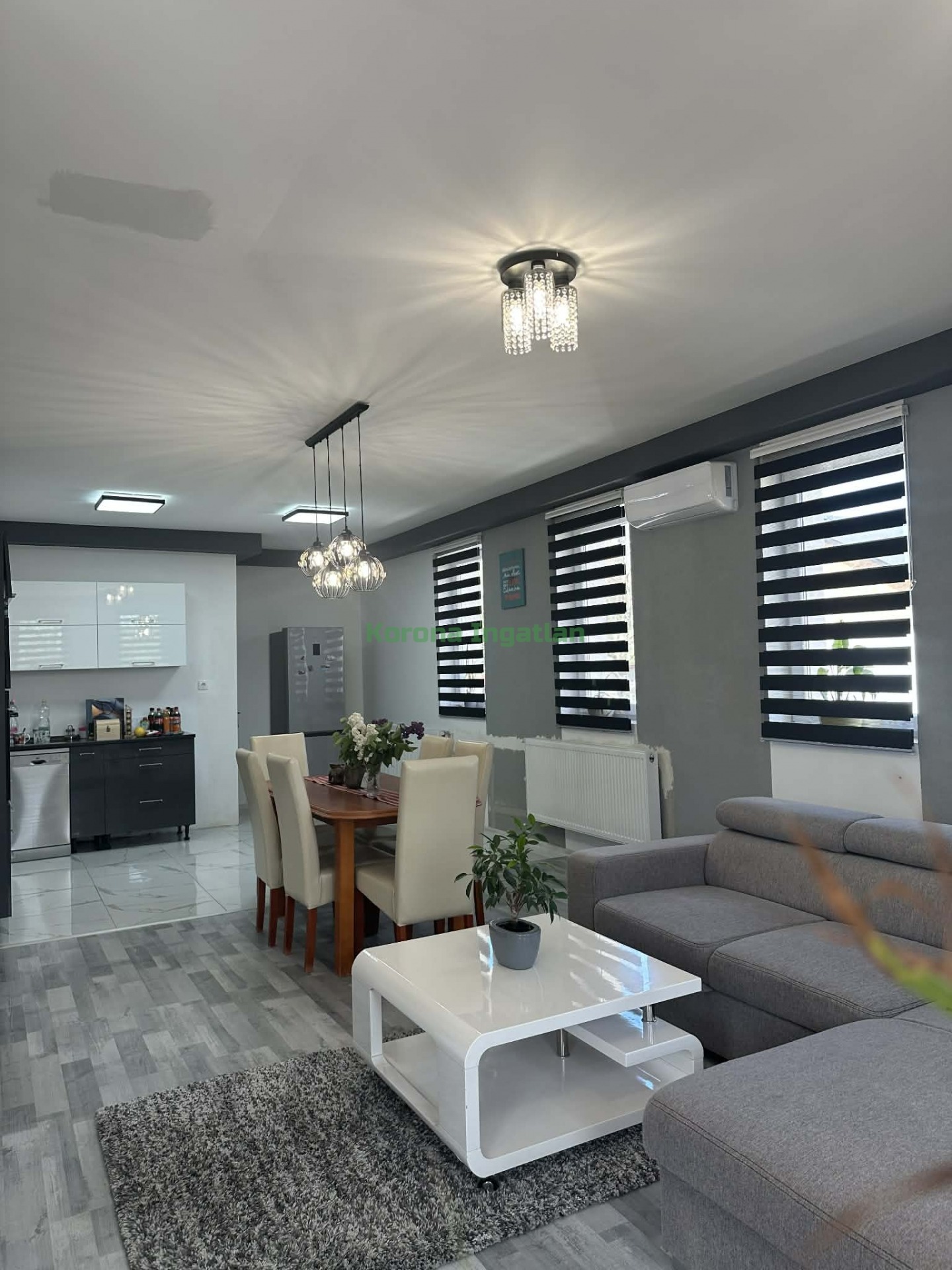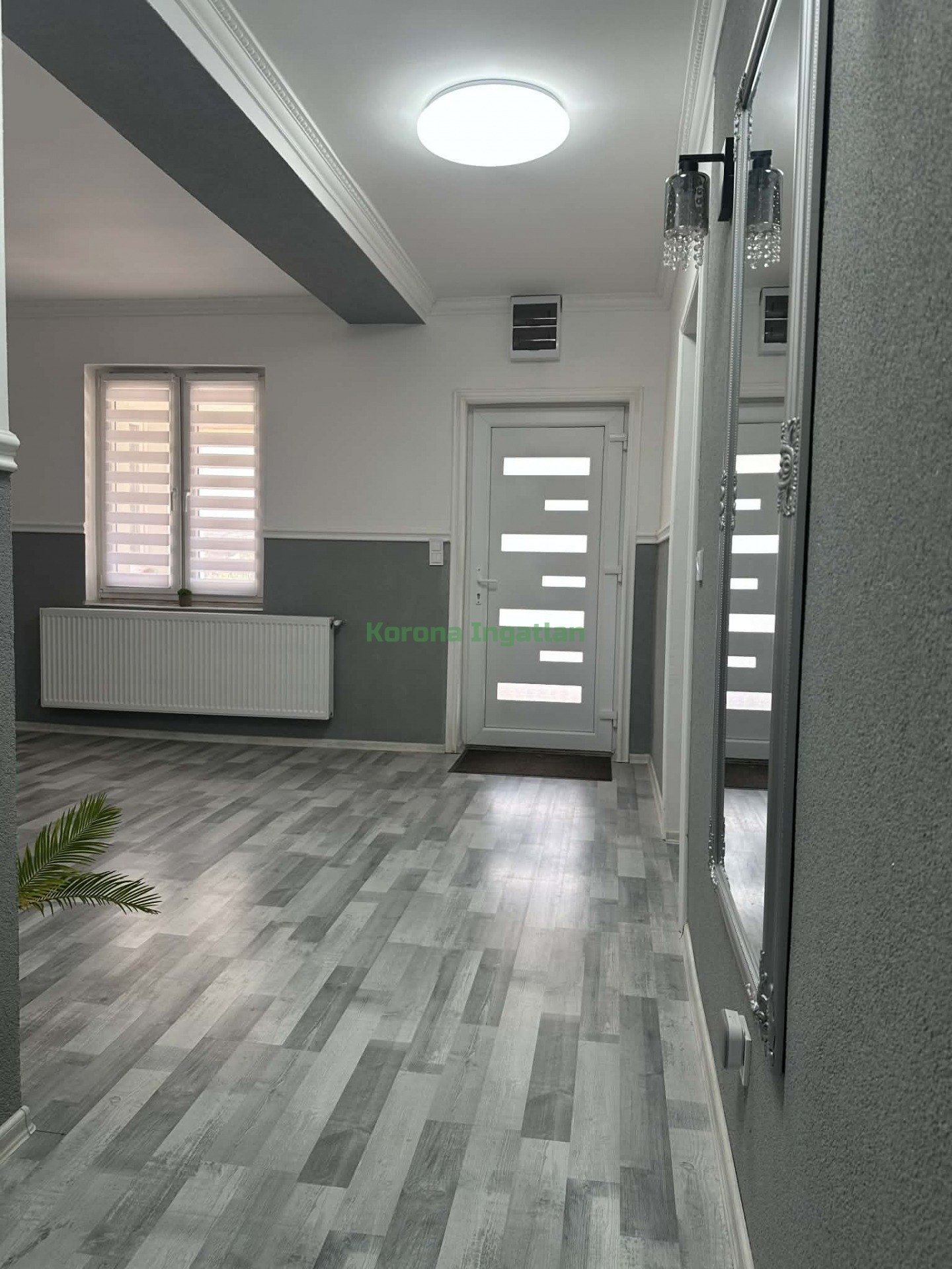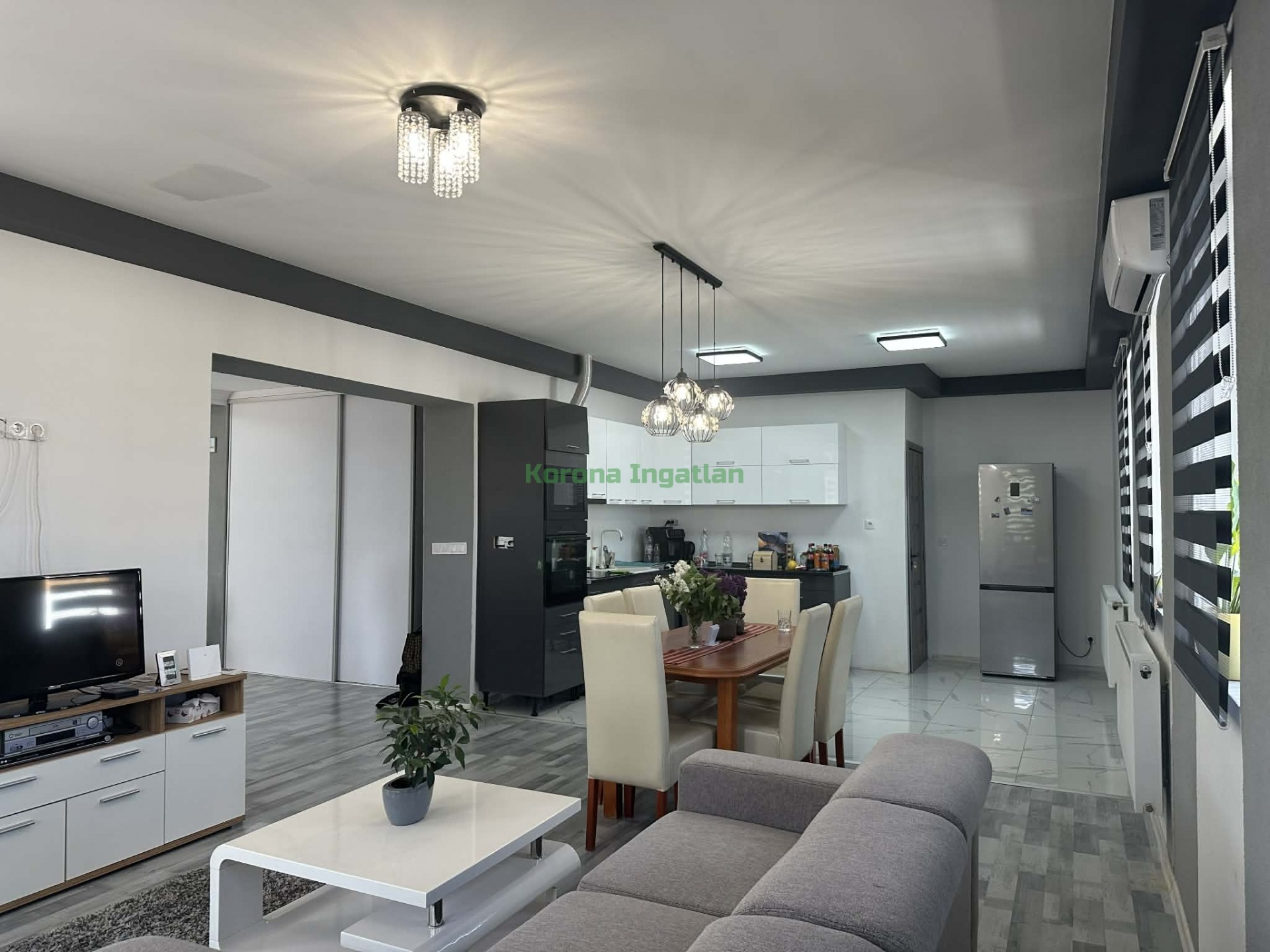 Helyiségek: hatalmas előtér, 2 külön nyíló szoba, nappali + amerikai konyha + étkező, fürdőszoba, külön WC.